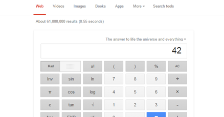 Who knew Googles calculator could work out the answer to life. Anyone who is familiar with The Hitchhikers Guide to the Galaxy will enjoy this one.